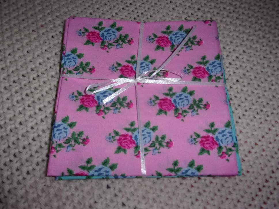 Mon troisième achat consiste en ce lot de cinq tissus. Ces carrés essentiellement fleuris mesurent 50 cm. Ce lot était affiché au prix de 1,92 euros. Quand j’ai vu ces tissus, je n’avais pas encore de projet défini à l’esprit mais une idée est apparue en feuilletant un catalogue glissé dans la boîte aux lettres. Après avoir pris des mesures, je verrai bien si j’ai suffisamment de tissus afin de réaliser ce projet. Comme ce lot est à prix abordable, j’irai acheter un deuxième lot en cas de besoin.