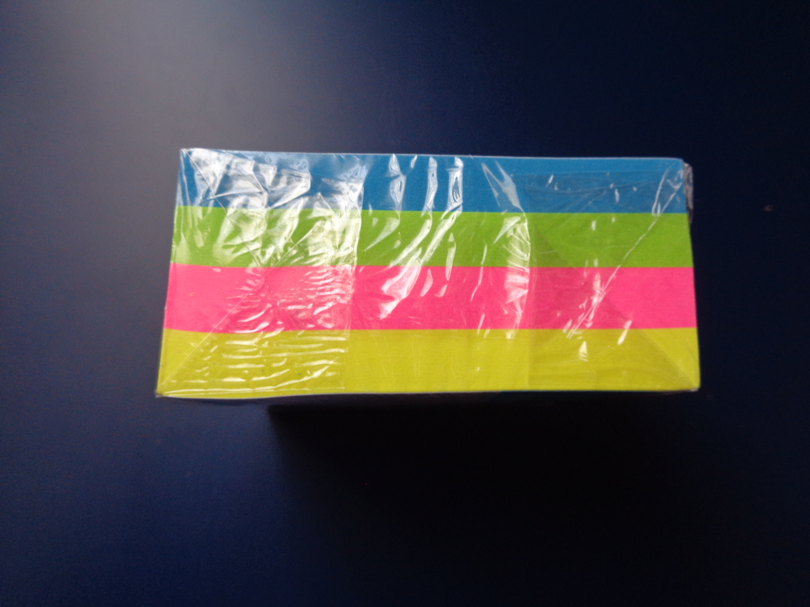 J’ai toujours besoin de noter, voilà pourquoi je possède autant de cahiers et de carnets en tous genres. Mais je n’avais pas de petits papiers à coller partout. En allant dans le rayon papeterie, j’ai trouvé exactement ce que je cherchais, à savoir des notes repositionnables. Ces notes comptent 4 couleurs et chaque couleur compte 100 pages. Je n’ai pris qu’un lot mais j’y retournerai quand j’en aurai à nouveau besoin. Bon, je suis tranquille quelques années avec 400 feuilles ! Ce bloc m’a coûté 89 centimes.